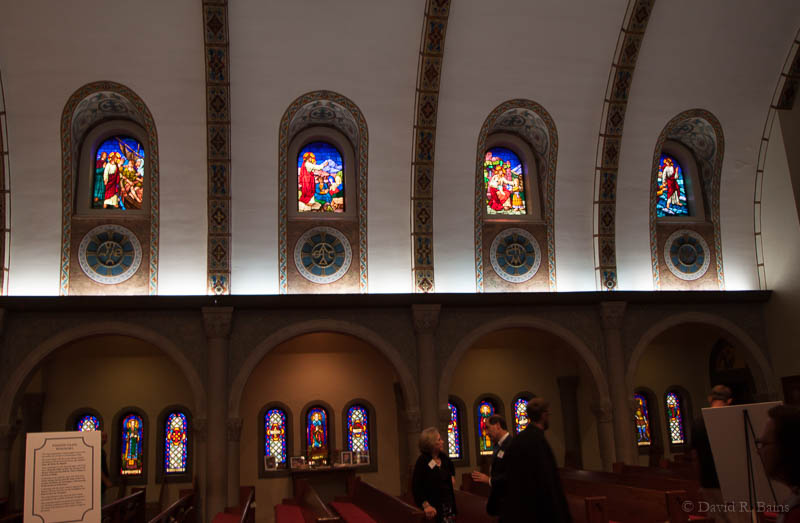 In the sanctuary there are paintings of saints on the curved wall of the apse. This evokes the seating that would have been there traditionally for the bishop and other clergy (called the synthronon).
