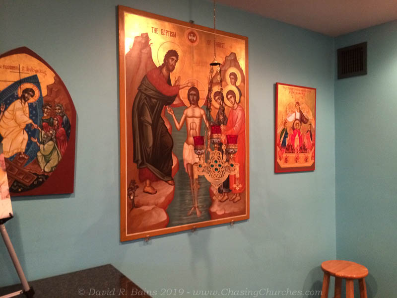 Immediately to the left of the entrance of the church is a small baptistery with an octagonal font. In the Eastern Catholic tradition, baptism is always by immersion and usually of infants. This room has three different icons on the walls, each with separate emphasis on the meaning of baptism. One icon depicts Jesus’ baptism at the hands of John the Baptist. This icon is incredibly important as it is a written portrayal of the Trinity as Jesus is presented as God and the Son and the Holy Spirit is represented with a flying dove above the scene. Although God is not pictured in this select iconography, this passage of the Bible is used to characterize the Trinity most often. In Matthew 3:16-17 the Holy Spirit descends as a dove and God is depicted through his voice when he says, “This is my son,” The Baptism of Jesus is commonly used as a referenced example of the Manifest Trinity. Jesus is portrayed with his usual reverence, looking strong and impressive, and holding his hand in a blessing. The angels to his right keep their hands covered in reverence, showing that they are in service to Christ (Nes 2004, 67). This icon is incredibly important for two reasons: it represents the story most commonly associated with the Trinity (the three persons of God) and it reaffirms the importance of baptism in the Christian church.