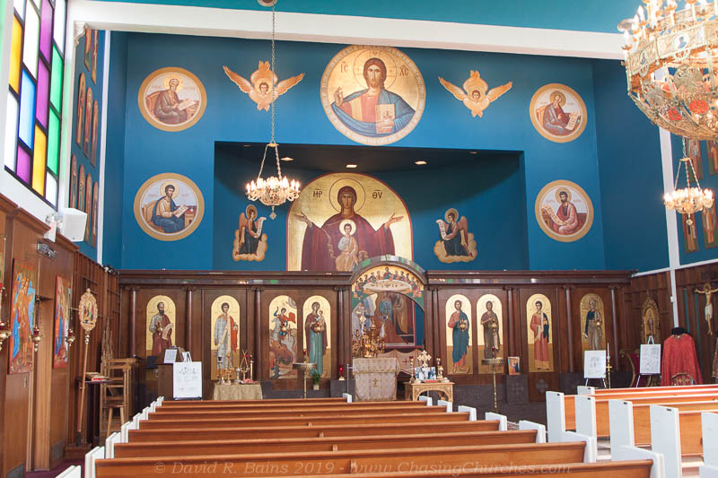 From the outside, no one would suspect the rich visual beauty portrayed inside St. George Melkite Greek Catholic Church in Birmingham, Alabama. St. George was founded in 1921 and erected its current building in a Modernist style in 1957. It is one of only forty-five Melkite churches in the United States. St. George is best known in Birmingham for hosting an annual festival, featuring baked kibbee, spinach pies, baklawa, dancing, and church tours. While other Birmingham churches have Mediterranean food festivals, St. George is the only Melkite church in all of Alabama.