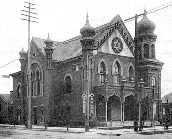 Temple Emanu-El was the first synagogue organized in Jefferson County, Alabama. Construction of the original temple began in late July 1886 it was located on the southwest corner of 17th St. and 5th Avenue N facing the park now named for Kelly Ingram. Like most American synagogues built in that decade it was “Moorish” in style with prominent onion tomes and a star of David at the forefront.