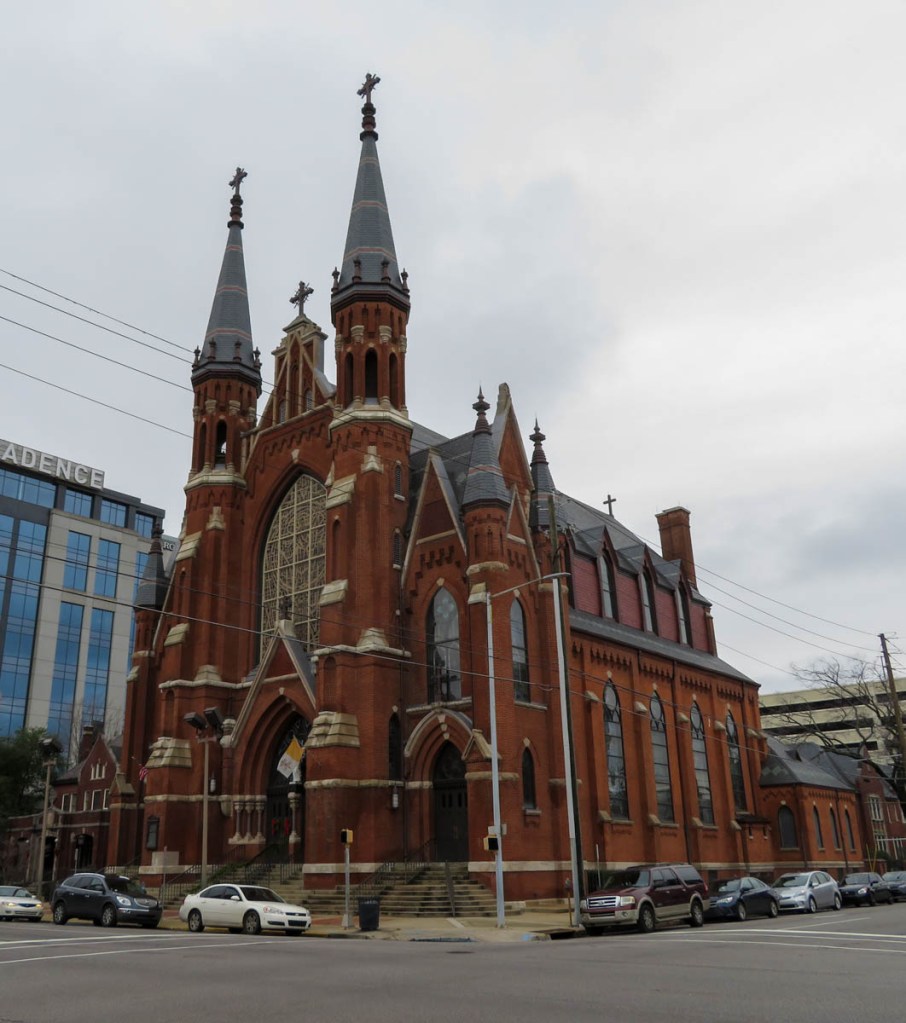 Saint Paul’s Cathedral is the mother church of the Roman Catholic Diocese of Birmingham in Alabama. The parish’s first church was built in 1872, directly across from the present church on 3rd Avenue North in Downtown Birmingham. This red-brick church was erected in 1890 to designs by Chicago-based architect Adolphus Druiding. Constructed in a neo-Gothic style with Italian-style detail, it features stained glass by Cincinnati firm G. C. Riordan & Company. The church is about as wide as it is tall. This makes the acoustics of the sanctuary phenomenal, particularly for voices–this is beneficial because music and worship is central to the life of The Cathedral of Saint Paul.