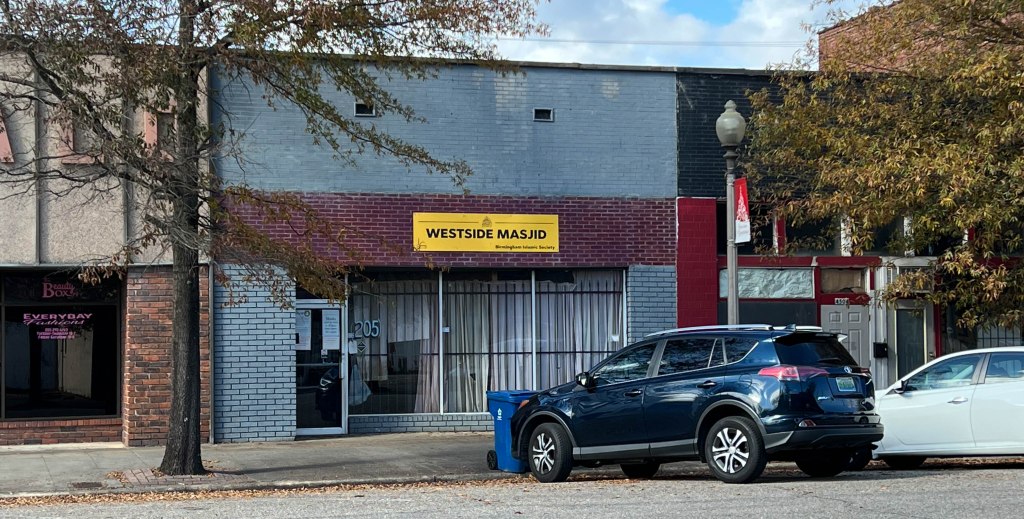 A store front on Gary Avenue in Fairfield, just off of I-20/59 serves as one of the places where members of the Birmingham Islamic Society (BIS) meet for prayer and worship. Known as the West Side Masjid, it opened in 2010 as the third of BIS’s centers. It joins The Church of the Reconciler (Charismatic Episcopal Church) and Urban Hope Community Church as one of several houses of worship on this formerly commercial main street.