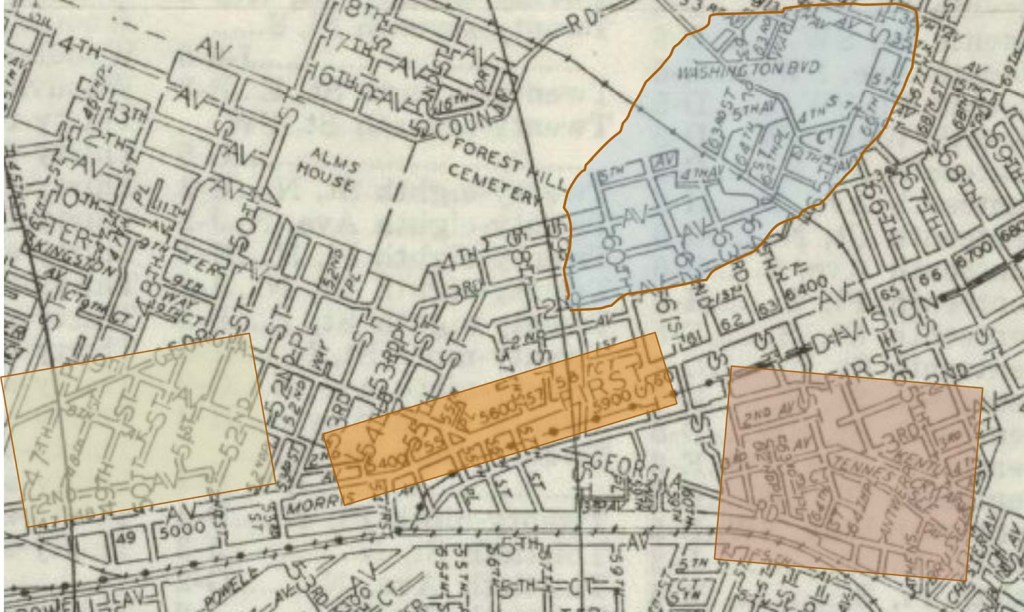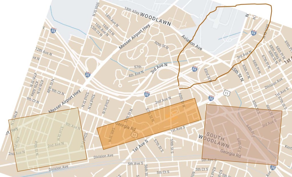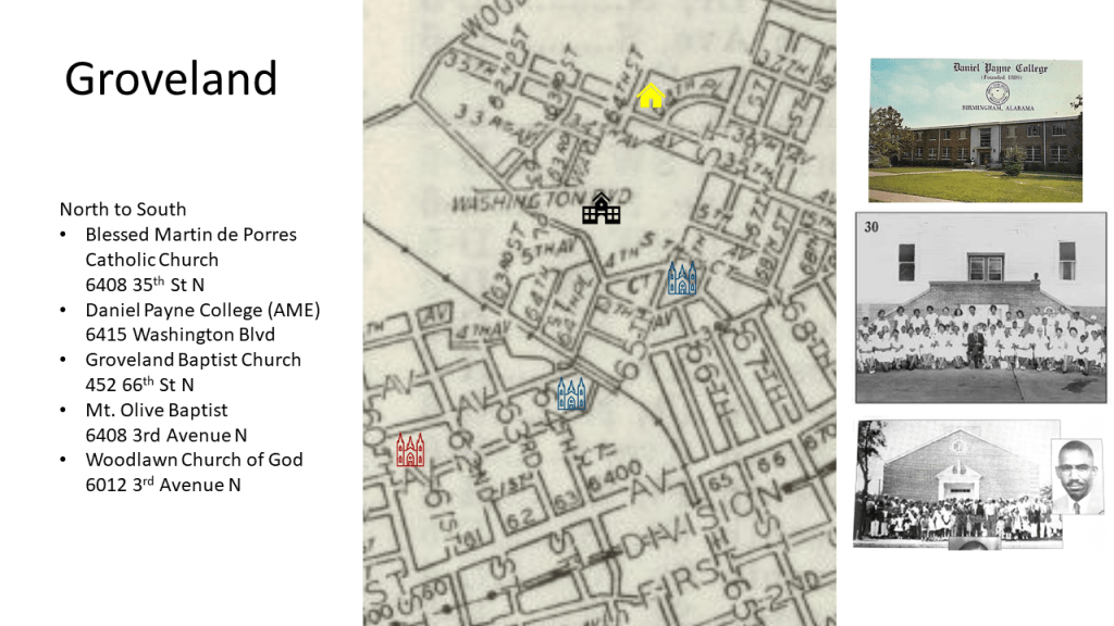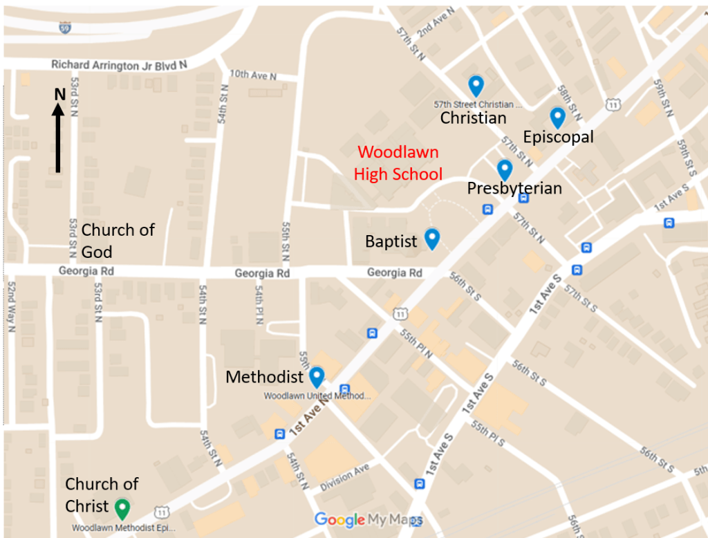 The churches are best understood as being located in four neighborhoods. Two were historically White: Central Woodlawn and West Woodlawn. Two were historically African American: Groveland and South Woodlawn. Three of these neighborhoods remain. Groveland became the site of the I-20 / I-59 interchange and the expansion of the Birmingham airport.