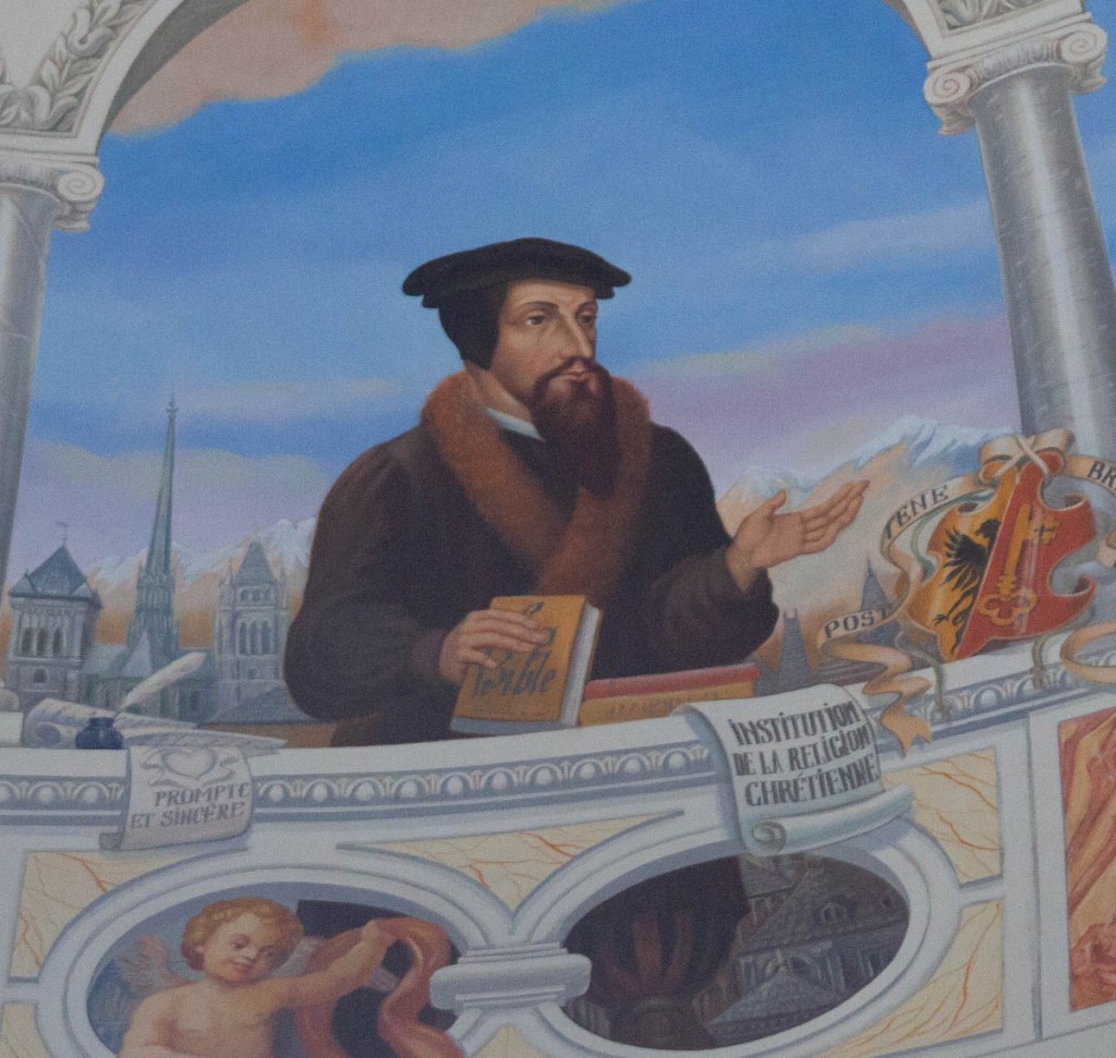 In the image, Calvin is depicted holding a Bible, while a couple more of his best works are displayed around him, as well as the coat of arms of Geneva. The Bible represents Calvin’s “accurate and clearly expressed understanding of Biblical truth”, meaning he simply interpreted the Bible how he saw fit (Hall 2008). To the right of Calvin is a parchment with the title “Institutes of the Christian Religion”’ written in French, referencing his first major theological work from 1536. Beside this is the coat of arms of Geneva memorializing Calvin’s devotion to the city, as well as honoring the work he contributed as a pastor to the Reformation in Switzerland and across Europe. Behind Calvin’s other side is the Saint-Pierre Cathedral in