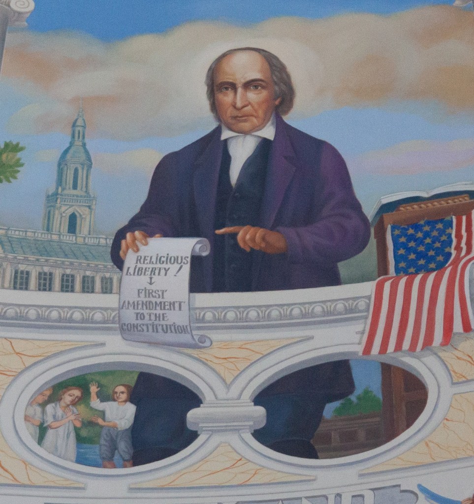 Leland is painted on the celling in Hodges Chapel on the campus of Samford University. Samford was established as a Baptist school, and to this day, still holds some Baptist beliefs. Lottie Moon is the second of the two U.S. Baptists shown on the celling. She is most known for her generous mission work abroad and is also an inspiration the Baptists everywhere. It is only right that in the chapel of a Baptist university, there are prominent Baptist figures pictured. If not for Leland, freedom of religion in the United States may have been near impossible to gain. In the mural, Leland is depicted with an American flag flowing. This symbolizes his aid in making America free. He is also pictured hold a paper that says, “Religious Liberty –> First Amendment to the Constitution”, showing that the only route to freedom was through the ratification of the First Amendment. In light of this, Leland worked tirelessly to ensure the amendment was passed. In the bottom left corner of the painting, there is a baptism going on. This is most likely because of the great number of baptisms Leland preformed in his many years of preaching. It could also be an ode to the importance of baptism in the Baptist denomination and the emphasis it has. Lastly, behind Leland’s shoulder, there is a white building. This building is meant to represent a government building, or more specifically Independence Hall in Philadelphia, where the first amendment was ratified.