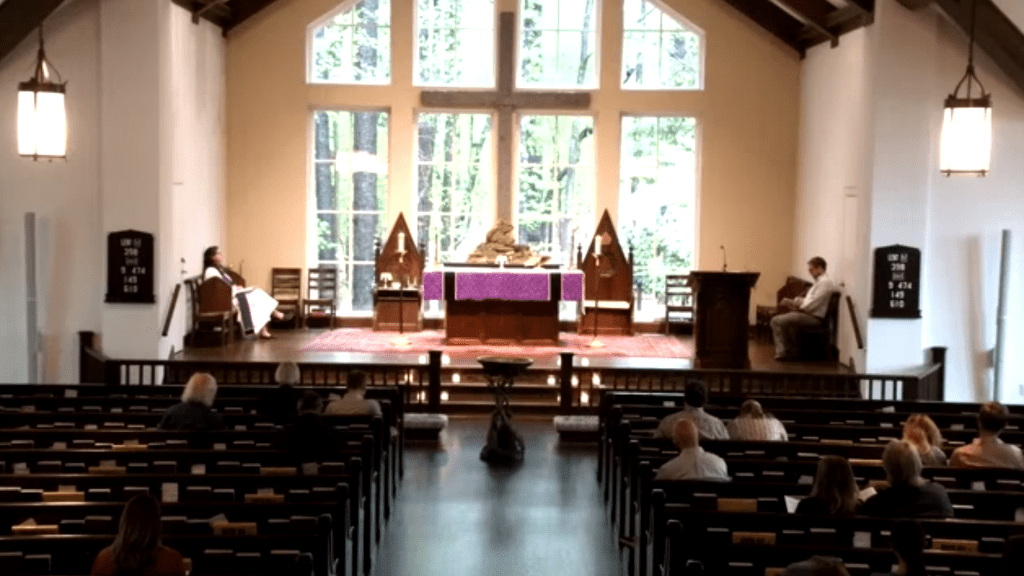 The interior of the church maintains a similar theme. The soft white color of the walls extenuates the wooden beams that span across the ceiling of the sanctuary and the hardwood floor and wooden pews are the perfect deep brown stained color. The light fixtures are ever-so-slightly reminiscent of a medieval castle, they hang down by a chain and if a candle was inside of each of them, it would surprise no one. The sanctuary walls are lined with windows on each side and lead you to the altar where a floor-to-ceiling window allows for natural light to fill the room. The windows allow for you to gaze directly at the beauty of God’s creation while the light of his sun permeates the building.