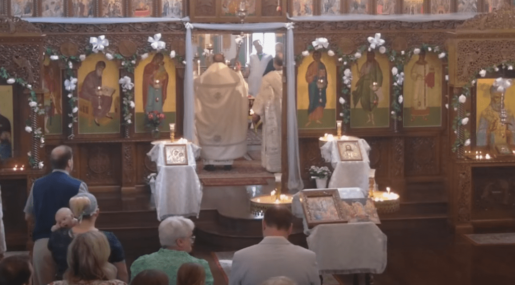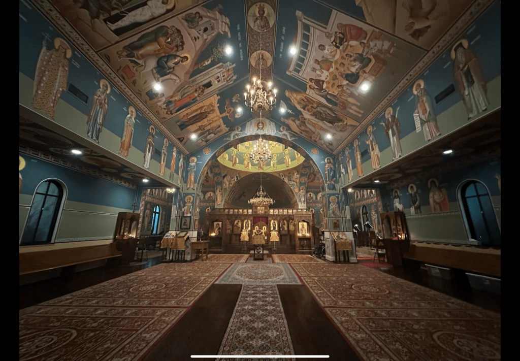 When you enter St. Symeon Orthodox Church you find images of saints and Christ on every wall, the smell of incense, a solid partition separating the nave (the people’s area) from the area around the altar (the sanctuary), and no pews or chairs facing the altar for the congregation to sit in. These are all distinctive elements of the Byzantine tradition of worship space.