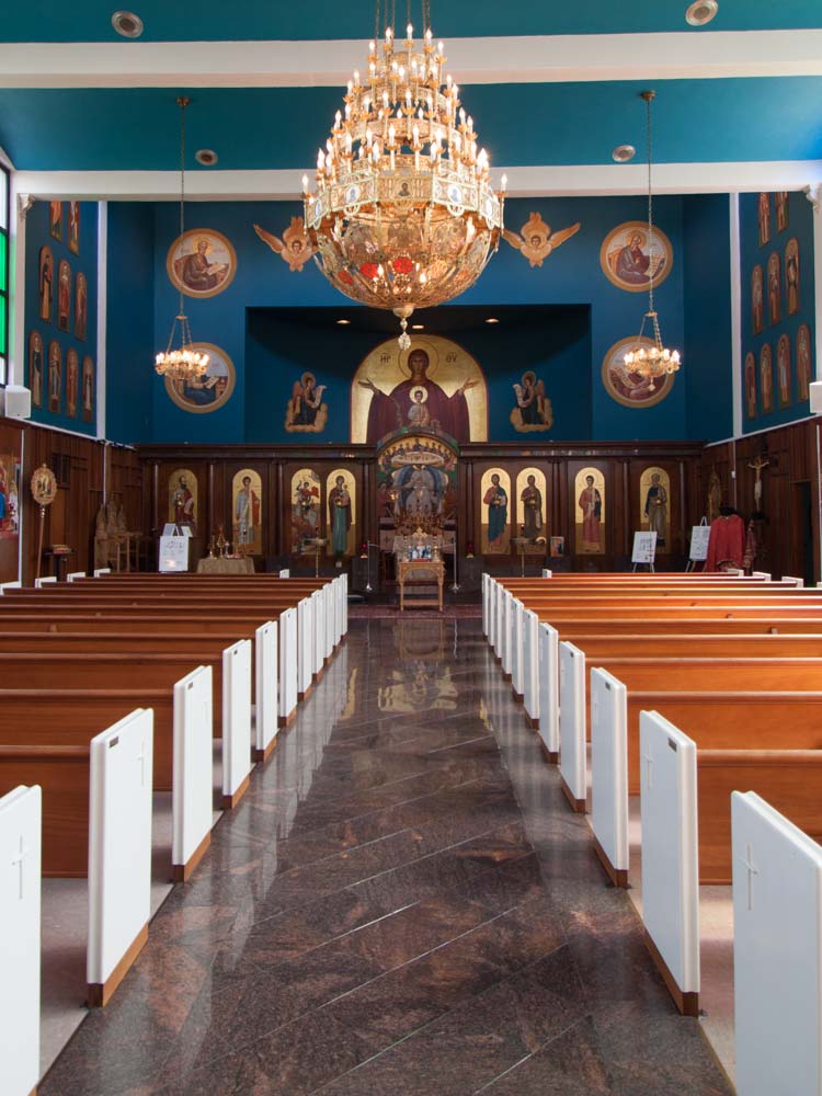 St. Symeon is the newest of the three Southside congregations. It was established in 1977. It also has the newest building (opened in 2015). Additionally, it is the one that strives most to depart from common American (i.e., Western) Christian traditions and recover distinctive practices of the Christian East. This is evident in its lack of rows of pews or chairs (there are benches along the wall should worshipers need to sit). The ancient postures for worship and prayer are standing, bowing, and, in certain Lenten services, prostration. You can see this in Orthodox churches with pews, but St. Symeon is crafted to make this the norm.