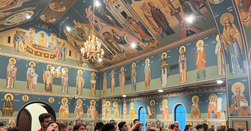 Most Orthodox writers on worship emphasize the fact that the worship in a church on earth participates in the worship of the church (the redeemed and the angels) in heaven. This is a good way of understanding why there are so many images of saints in Orthodox churches. The walls of St. Symeon are covered with them. These include not only the icons commissioned by the parish from its Romanian iconographers, but also the many small icons from many sources that line the lower walls of the nave.