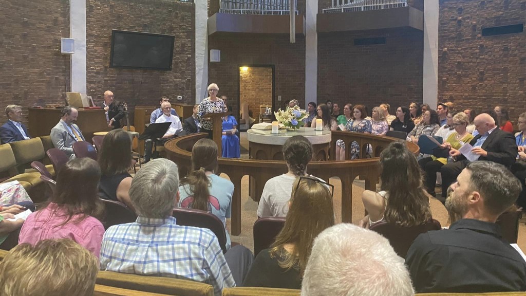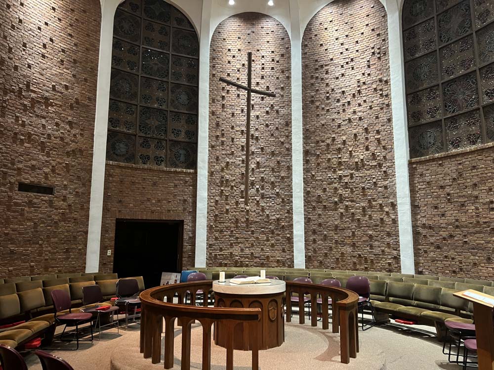 Yeilding Chapel at Birmingham-Southern College is the oldest of these. It opened in 1967. It is a tall brick cylinder with four large stained-glass windows, each keyed to a color of the church year. In the middle is a circular altar inside a circular communion rail above it is suspended a cross a silver mobile above suggests the decent of the Holy Spirit and is lit by a stained-glass oculus in the center of the space (Jackson 2024). Pews circle the altar, constraining the freedom of movement in this innovative space. Originally a pulpit stood opposite the main entrance to the circle.