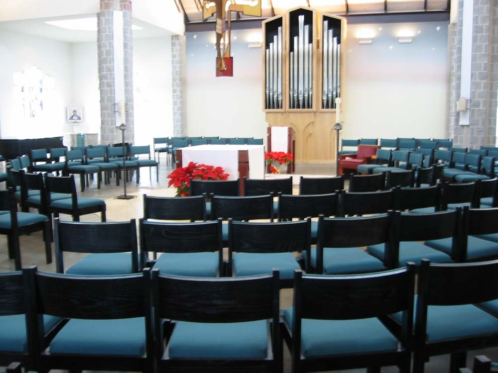 After the church became a chapel of the cathedral parish, a number of changes were made that made the chapel more like a “typical” Catholic Church. Most importantly, the tabernacle was moved to in front of the organ, and the ambo moved to the side opposite the presider’s chair and a low screen placed around it.