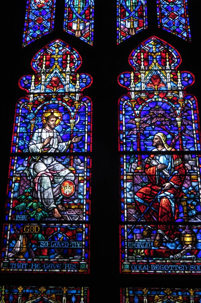 The stained glass windows at IPC and Trinity both employ small peices of glass in the mosaic Gothic style, but use them to create large scenes that are fairly easily read by worshipers in the pews. Unlike the painterly windows at Sixteenth Street Baptist, however, they are not directly based on paintings and are arguably more authentic to the medium of stained glass: They carefuly modulate the light entering the nave and appear flat, rather than suggesting a depth of field.