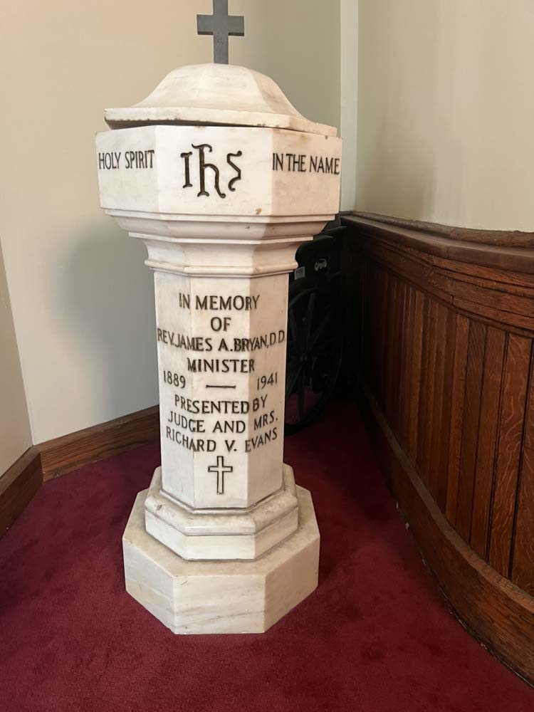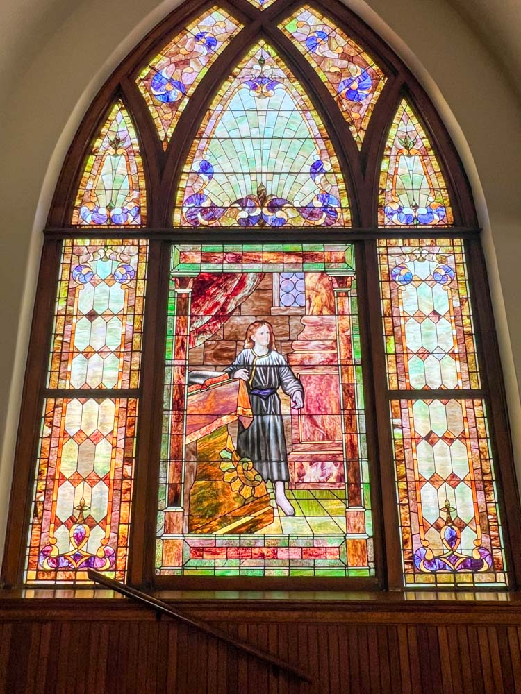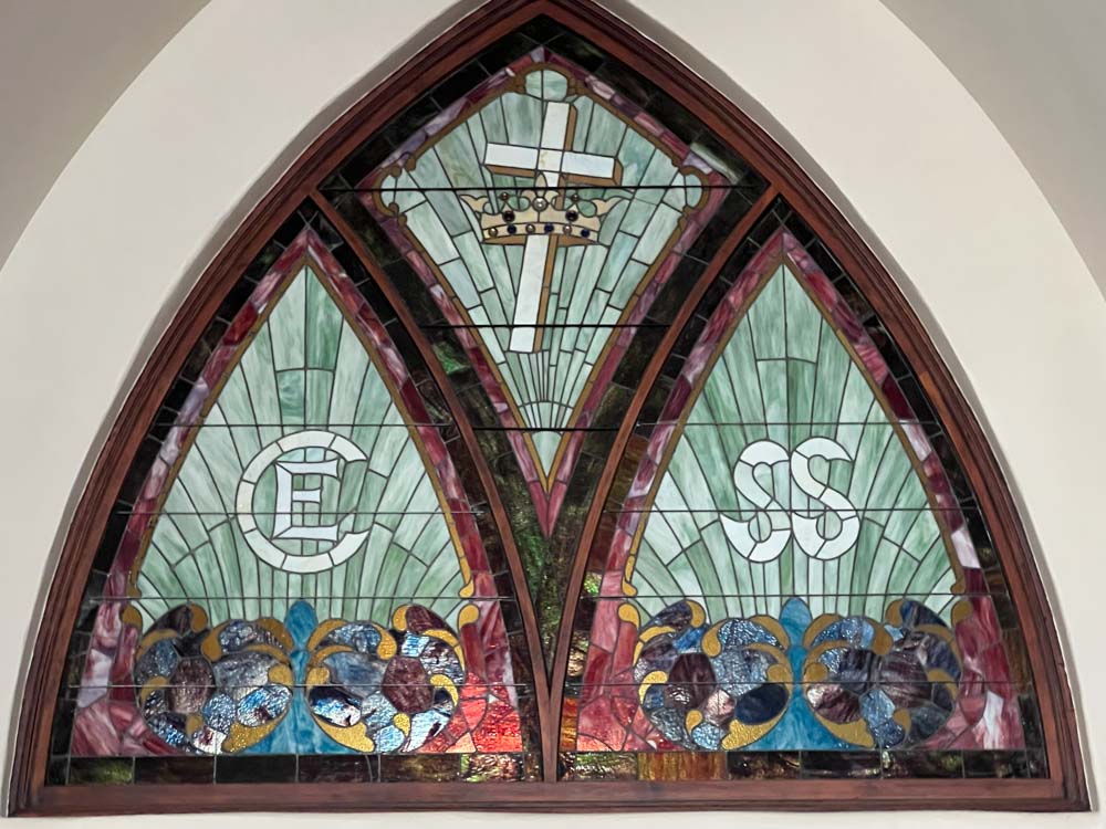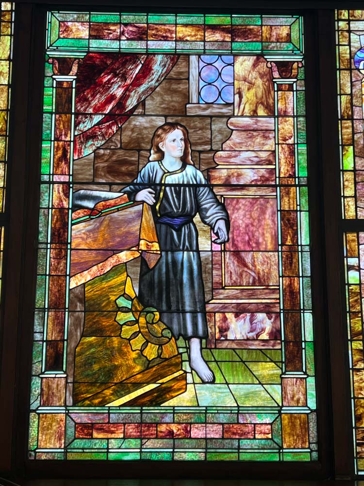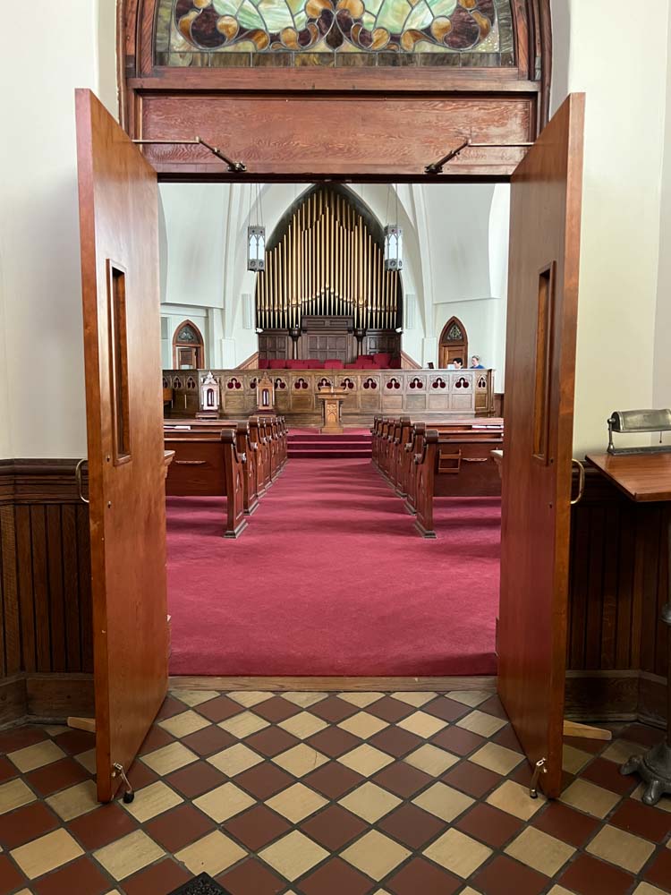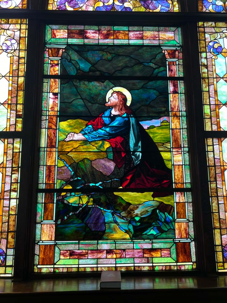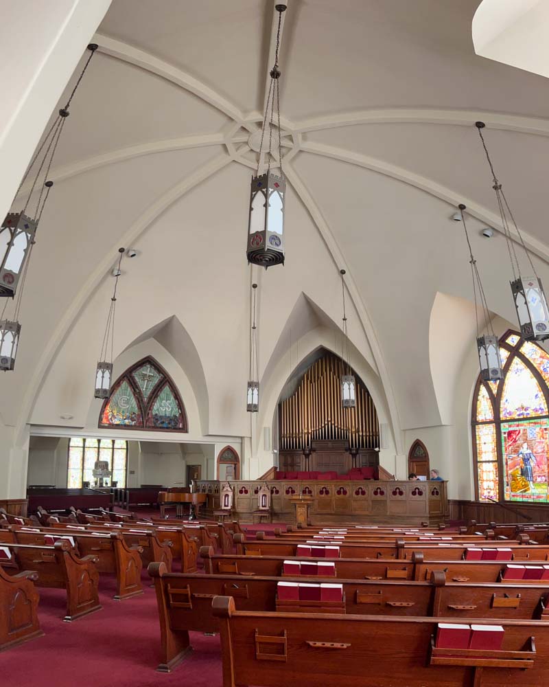 Also here the original pulpit platform has been expanded to accomodiate an enlarged choir. (In 1901 choirs were often quite small: four or eight voices.) But in many other respects Third Presbyterian is a remarkably well preserved example of a once very popular form of church building. Its windows include three of the five most popular scenes from the life of Christ included in such churches. The building has had the great fortune to be continuously owned by the same congregation. Click on the photos in the gallery below to enlarge them and explore the worship space.