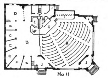 But what about smaller neighborhood churches? For them Kramer advised a “combination church.” In such churches, the Sunday school was not a housed in a separate space below the auditorium (as was common and the case at Sixteenth Street Baptist), rather it was placed next to or behind the auditorum and moveable partitions enabled these spaces to be combined with the auditorium to accomodate large crowds. Kramer particularly recommended the “Pulpit in the Corner Church,” where the pulpit was placed in the corner of a square with the congregation arrayed in curved pews about the platform. The Sunday school space adjoined the main auditorium along a side of the square adjacent to the pulpit platform. This allowed for “doubling the audience without increasing the distance of any, or changing the location of the speaker materially” (Kramer 1897, 222).