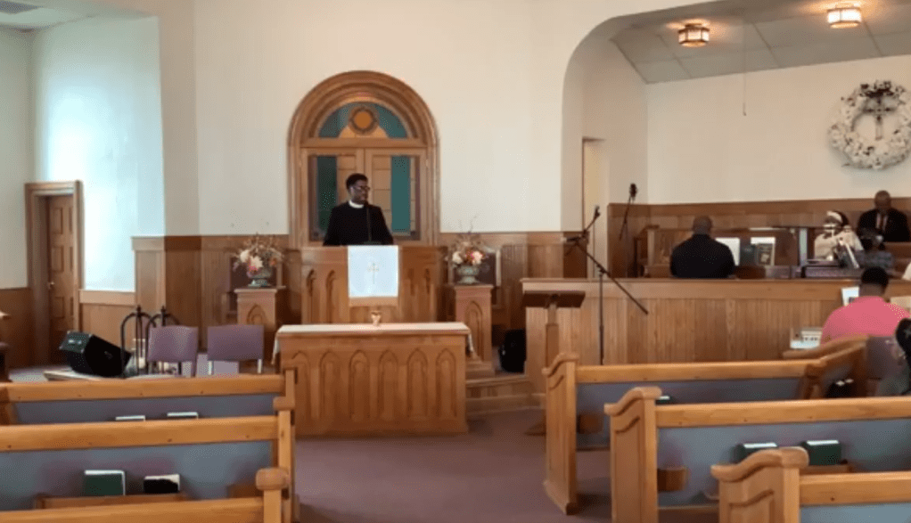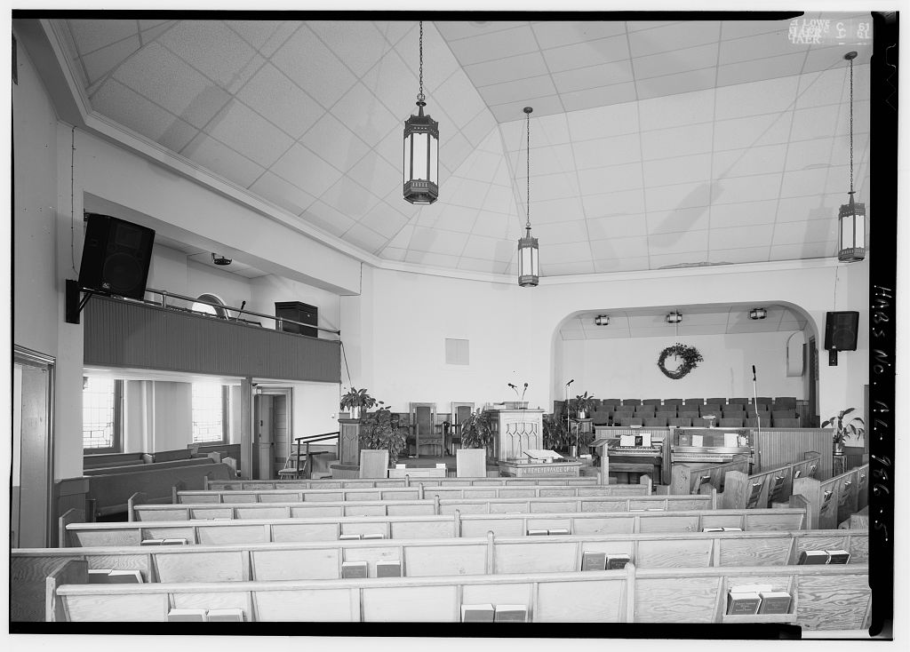 Notice in the floor plan above that the baptismal pool is located beneath the platform. Part of the floor would be lifted to access it. Since the 1994 survey, the church has been renovated and a baptismal pool has been added in what was originally the pastor’s study behind the pulpit. As the screen shot below from a recent worship service shows. (The church added an additional building with classrooms and offices adjoining this building in 1966.)